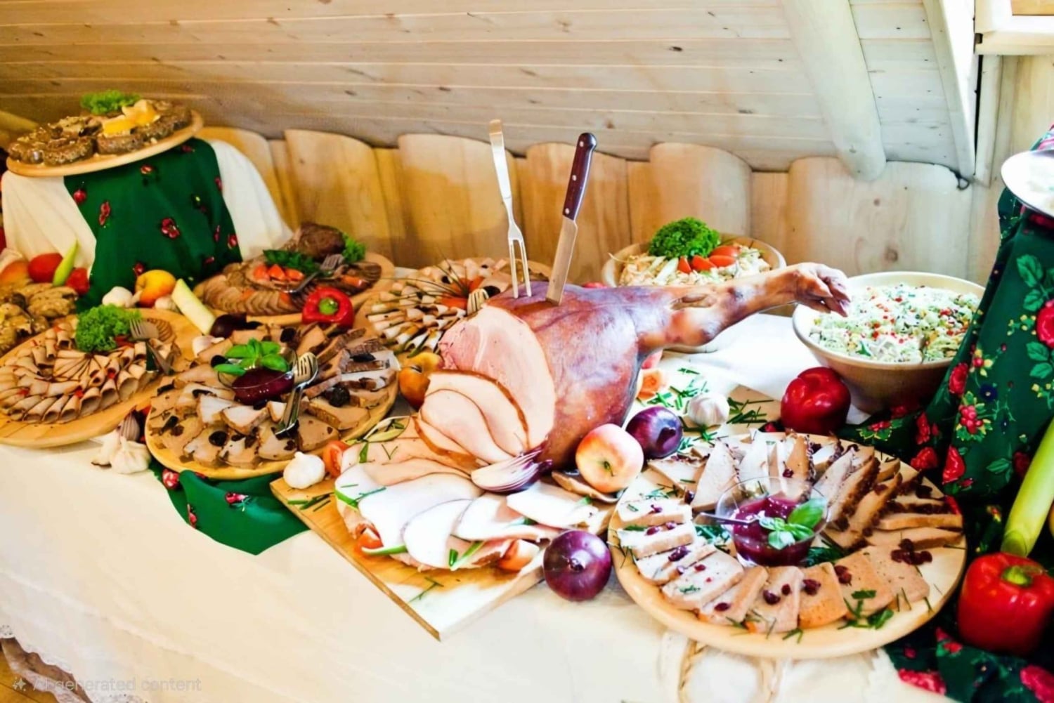 Buffet met salades, regionale kazen, sappig fruit uit Poolse boomgaarden