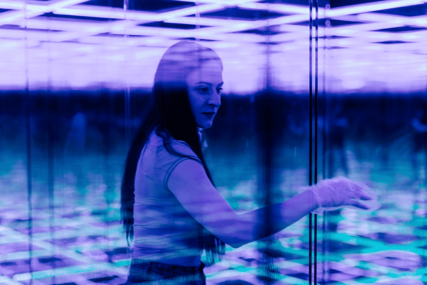 O labirinto é feito inteiramente de vidro, criando uma experiência visual única